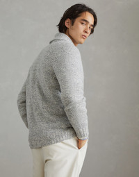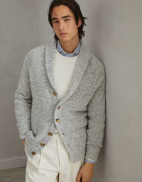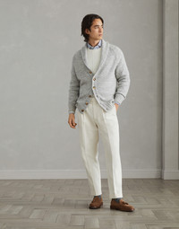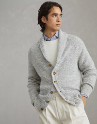 Accurate materials research and the iconic knitting of Brunello Cucinelli knitwear enhance the classic feel of this Mouliné cashmere cardigan. The typical streaked appearance of the mouliné knit highlights the season's nuances and the enveloping look of the garment. The regular fit is complemented by a raglan sleeve construction. MATERIALS The pure cashmere yarn’s moulinè effect is crafted with a two-strand thread in different colors of the season to create a compact and regular streaked texture. DETAILS Button closure Shawl collar Plain stitch 100% CASHMERE