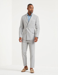 The versatile touch of Natural Comfort virgin wool pairs perfectly with the modern, effortless silhouette of this suit. The fit of the one-and-a-half-breasted jacket is characterized by tapered lines through the chest with slightly pronounced shoulders to highlight the male physique. The leisure fit pleated trousers feature modern proportions in the seat and a slight low-rise, while the cut of the leg remains close to the body. MATERIALS “Natural comfort” virgin wool is a very comfortable and versatile refined fabric that is ideal to wear at different times of the year thanks to the superior qualities of the natural fiber. DETAILS *Blazer* 6 horn button closure Welt pockets with flap, ticket pocket and chest pocket Cuffs have four horn buttons and functional buttonholes Cupro half lining Two interior pockets with button closure and pen holder Double back vent *Trousers* Zip closure with button and backing button Slanted front pockets Pleat Back pockets with flap and button 19 cm hem Leisure fit: the rise and seat are soft and the proportions of the leg are tapered 100% VIRGIN WOOL