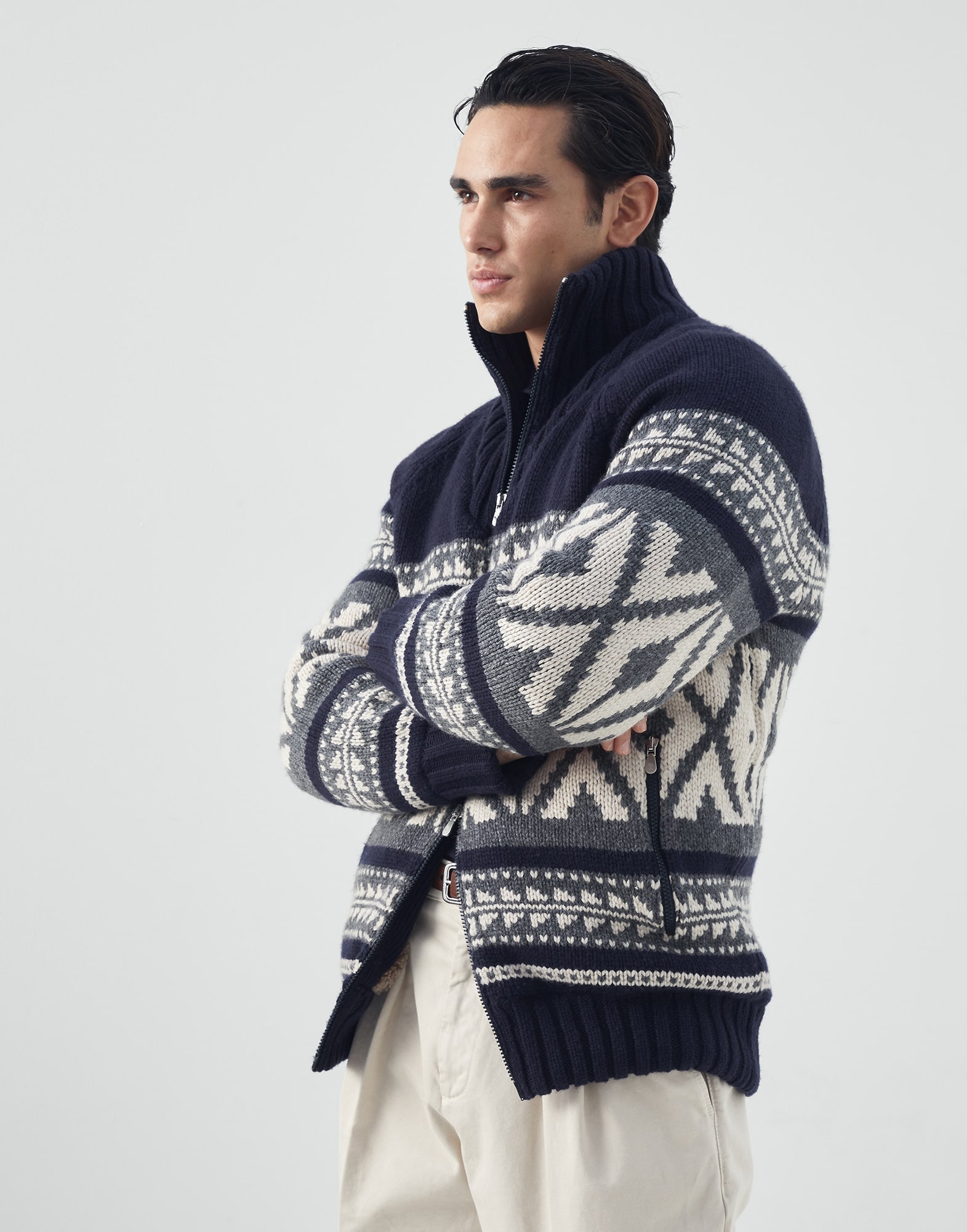 Fine material combinations and traditional patterns inspire the definitely wintry feel of this shearling-lined cashmere cardigan. Geometric patterns woven in different colors of the season accentuate the yarn’s voluminous and lightweight texture with a subtle retro effect. The shearling inner lining and light Thermore® padded sleeves provide added comfort and protection. MATERIALS Cashmere Feather yarn is a refined and lightweight yarn featuring a tubular structure that increases volume tand enhances the soft and cozy effect of the natural fibers. DETAILS Two-way zip closure High collar Hand pockets with zipper Rib knit cuffs and bottom band Jacquard-knit Shearling lining 100% CASHMERE