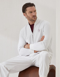 The sporty yet elegant feel of the world of Tennis inspires a selection of creations that enrich the Menswear collection. The cool lightness of nylon defines the spirit of this fully unlined bomber-style top, a versatile garment that is perfect for milder climates. The silhouette’s regular proportions are completed by iconic Brunello Cucinelli details such as the rib knit bottom band and the chest logo. MATERIALS Nylon is a light, versatile material: glossy with a slightly crisp hand, it is ideal to wear during the transitional seasons. DETAILS Two-way zip closure Rib knit collar Hand pockets with zipper Rib knit cuffs and bottom band Unlined 93% POLYESTER, 7% POLYURETHANE