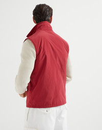 Modern, innovative materials provide function and protection to this microfiber vest, which showcases a simple, essential silhouette. The garment features the classic codes of casual outerwear and inserts contrasting elements, such as the characteristic shirt collar, snap closures and side pockets. The surface of the fabric is smooth and silky, while the lightweight Thermore® padding on the inside provides warmth and protection. MATERIALS A refined Japanese fabric, microfiber is crafted from a polyamide core wrapped in strands of polyester. Special processing gives the surface subtle shimmer, a velvety texture and also makes the fabric very fluid and pleasant to touch. Lastly, a finish is added to help protect the fabric from light water contact. DETAILS Snap closure Shirt-style collar Chest pocket Hand pockets with snap Lined Two interior pockets with button and pen holder Thermore® padding 70% POLYESTER, 30% NYLON