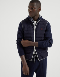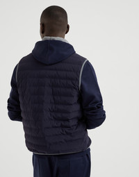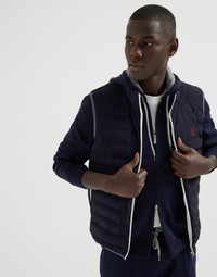 The excellence of Brunello Cucinelli materials enriches the versatile style of this bonded nylon down vest, a part of the Travelwear line dedicated to relaxation and leisure. An ultra-lightweight fabric with a distinctly technical, sporty feel is combined with soft, lightweight filling made of high-quality goose down and feathers, making it perfect to wear in the spring over blazers, sweatshirts and sweaters. The practical snap closure and the removable hood accentuate the garment's comfort, while the Solomeo logo on the chest adds a personalized detail. MATERIALS The nylon is a lightweight fabric equipped with a thin inner membrane that provides weather-resistance without compromising breathability. The high-quality goose down and feather fill is paired with a lightweight nylon lining. All of the padding used comes exclusively from European suppliers who are members of the EDFA (European Down and Feather Association), guaranteeing animal and environmental welfare. DETAILS Two-way zip closure Stand-up collar Pull-out hood Hand pockets with zipper Two interior pockets with zip closure Water-resistant nylon lining 83% NYLON, 17% ELASTANE