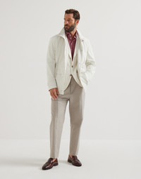 Light and airy, these panama trousers combine refined workmanship and yarns to make wearing feel natural and comfortable. The cotton and linen fibers give the fabric a compact hand and a distinctive irregular coloring. The modern fit offers soft volume in the seat and a slight low-rise, while the cut of the leg remains close to the body. MATERIALS The distinctive basketweave pattern of panama fabric, crafted through a plain weave technique, provides structure and visual depth while blending the soft hand of cotton with the delicate slubbed appearance of linen fibers. DETAILS Zip closure with button and backing button Slanted front pockets with watch pocket Back welt pockets Plain hem 69% COTTON, 31% LINEN