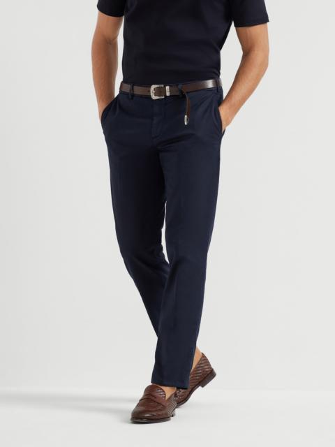 The classic character of the Italian fit trousers is enriched with the excellence of American Pima gabardine, a precious cotton fabric with superior characteristics. The Italian fit remains close to the body, but at the same time, offers slightly softer lines than the more traditional cuts. MATERIALS The American Pima cotton variety offers superior quality in terms of length, luster and strength of the fiber. Furthermore, garment-dyeing creates a particular finish that gives the color a dusty appearance and slight visible shading along the seams. A small percentage of spandex perfects comfort. DETAILS Zip closure with button and inner-buttons Slanted front pockets Back welt pockets with button Lining to knee 17.5 cm (6,89") hem Italian fit: the fit is fitted and balanced, with a regular seat and waist 97% COTTON, 3% ELASTANE