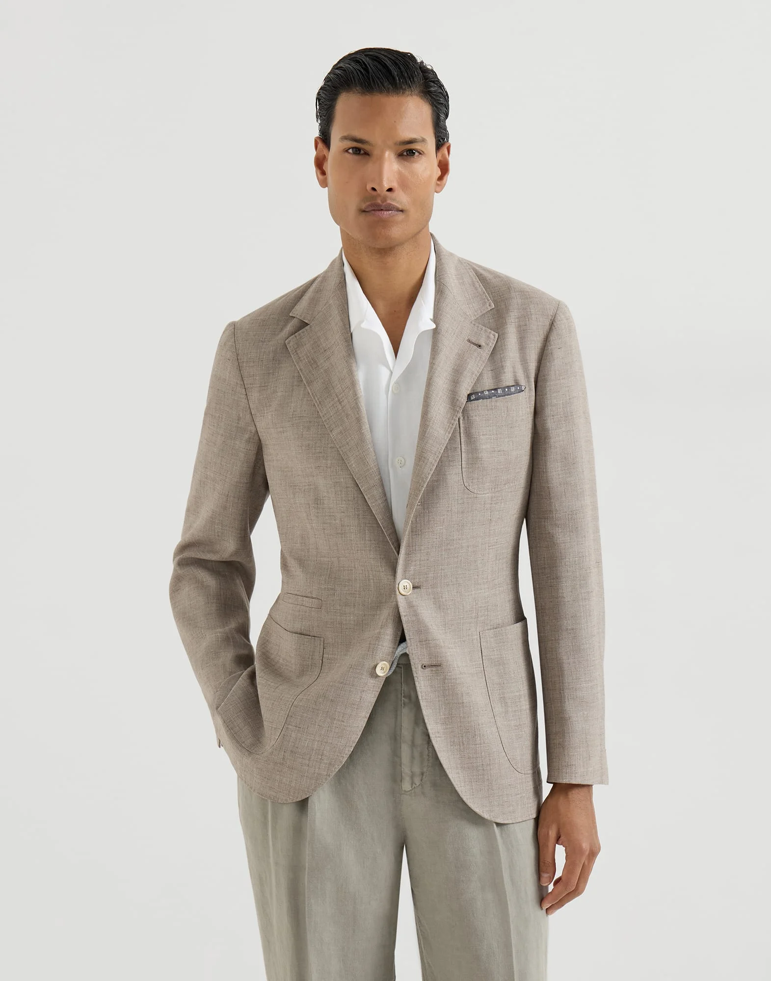 Contemporary volume and inspiration are conveyed in the fluid design of this wool, silk and linen deconstructed blazer, completed with classic lapels and patch pockets. The blend of the natural fibers gives the fabric a soft, light hand, as well as a distinctive slubbed effect. The “Solomeo Shoulder”, named after the hamlet where the company is located, characterizes the Brunello Cucinelli blazer with signature proportions. The tapered and pronounced cut of the shoulder enhances the male physique without the need for padding. MATERIALS The lightweight wool, silk and linen fabric combines the natural properties of different yarns, resulting in a crisp, glossy material with a compact texture enriched by a characteristic slubbed appearance that creates irregular color effects. The cupro lining provides added comfort. DETAILS 3-roll-2 closure with horn buttons Notched lapel Cuffs have four horn buttons and functional buttonholes Patch pockets, ticket pocket and patch chest pocket Cupro half lining Two interior pockets with button closure and pen holder Double back vent Drop 7 65% WOOL, 20% SILK, 15% LINEN