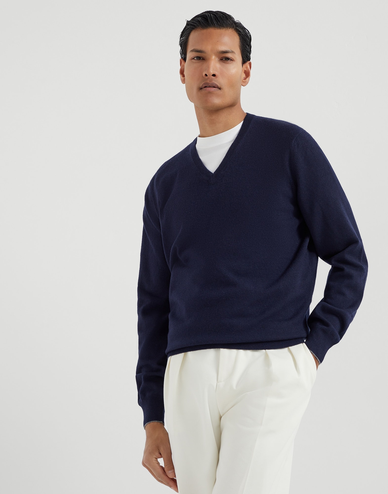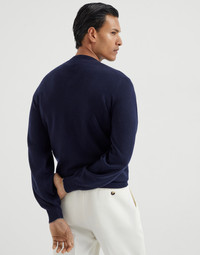 Precious cashmere fiber enhances the long sleeve sweater, a four-season men's wardrobe piece. A narrow, contrasting color trim on the cuff and collar edges adds a refined detail to the garment which offers a regular, close-fitting shape. MATERIALS The noble cashmere fiber is characterized by an extreme fineness and also for its precious insulating qualities which guarantee warmth, providing coverage and lightness when worn. DETAILS Rib knit V-neck Rib knit cuffs and bottom band Plain stitch 100% CASHMERE