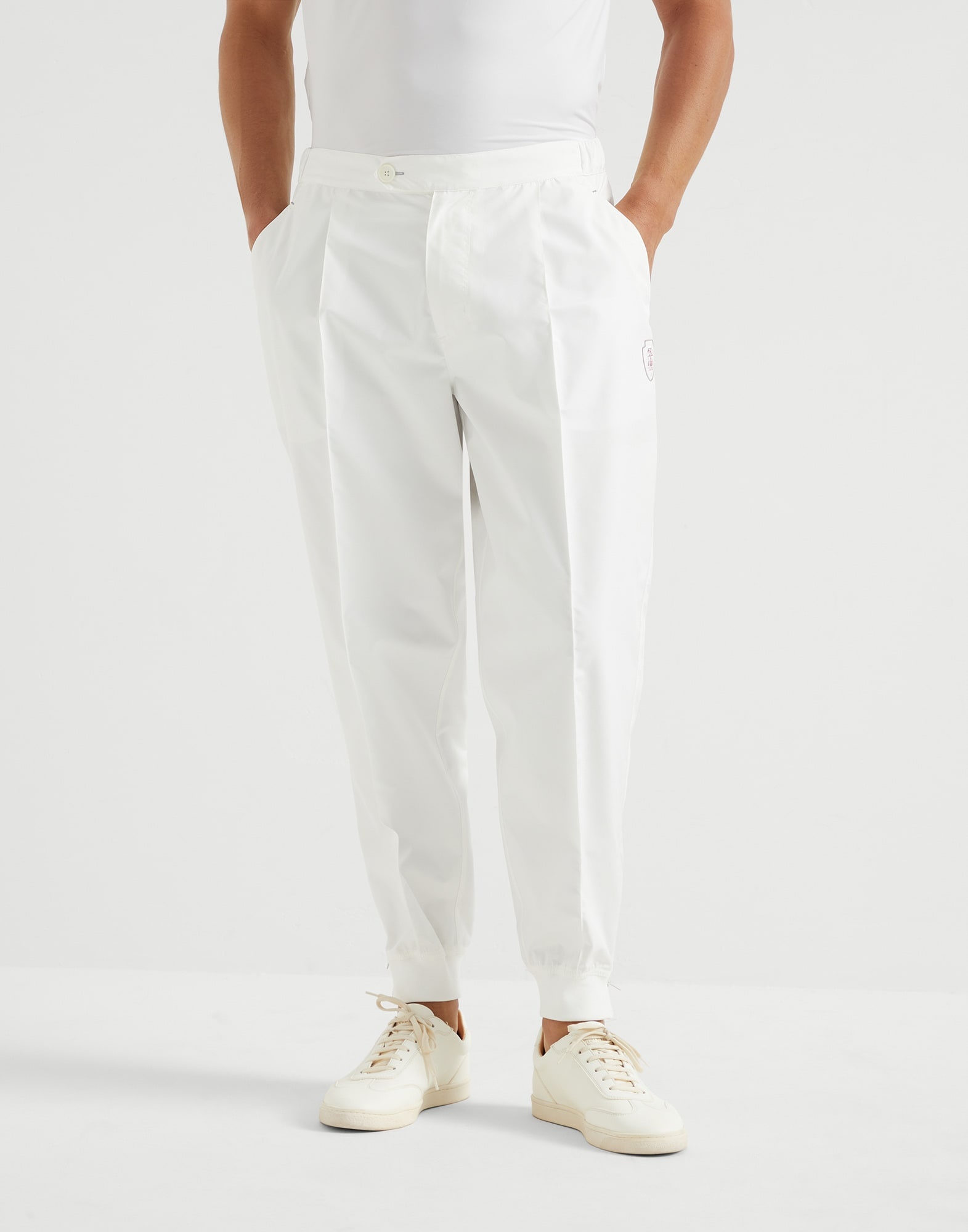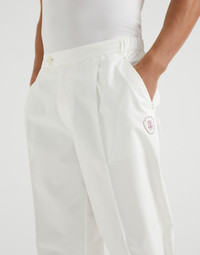 The sporty yet elegant feel of the world of Tennis inspires a selection of creations that enrich the Menswear collection. The cool lightness of nylon defines the versatile spirit of these trousers, enriched with tailored elements that create a balanced design contrast. The tabbed waistband and front crete are combined with elasticized cuffs with ankle zippers, completing the garment’s comfortable fit. MATERIALS Nylon is a light, versatile material: glossy with a slightly crisp hand, it is ideal to wear during the transitional seasons. DETAILS Zip closure with button and backing button Elastic waistband Pleat Slanted front pockets Back welt pockets Rib knit hem with zipper 93% POLYESTER, 7% POLYURETHANE