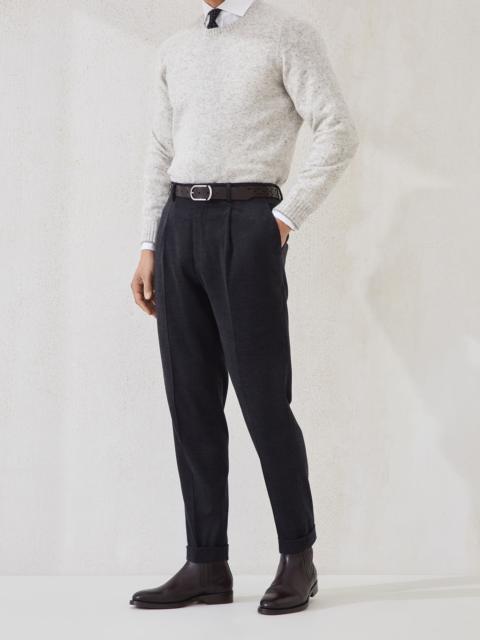 Vintage inspiration and a careful selection of materials elegantly define the silhouette of these leisure fit pleated trousers. The natural properties of the wool, silk and cashmere fibers provide warmth, lightness and a sheen to the classic corduroy’s smooth, fluid surface. The modern leisure fit offers soft proportions in the seat and a slight low-rise, while the cut of the leg remains close to the body. MATERIALS An innovative reinterpretation of classic corduroy is delivered in a blend of wool, silk and cashmere, and is enriched with a warm, light and comfortable texture thanks to the natural properties of the fibers. DETAILS Zip closure with button, metal hook and backing button Slanted front pockets Pleat Back welt pockets Cuffed hem Lining to knee 77% WOOL, 20% SILK, 3% CASHMERE