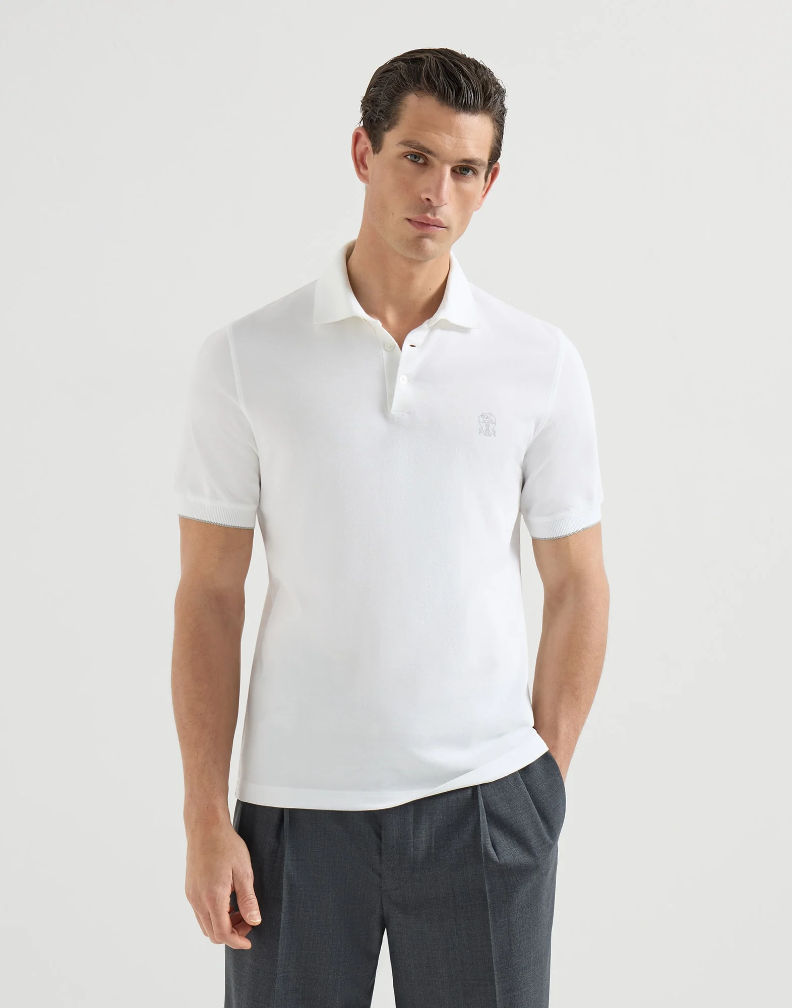 The excellence of Brunello Cucinelli materials enriches the versatile style of this soft cotton pique polo shirt. The garment showcases a sophisticated detail: the embroidered logo on the chest is designed in the same color as the stripe on the edges of the collar and sleeves. The silhouette features regular proportions. MATERIALS A classic menswear fabric, the lightweight pure cotton pique features the traditional honeycomb weave. DETAILS Shirt-style collar with button opening Sleeves with rib knit cuffs Flat pressed hem Regular fit 100% COTTON