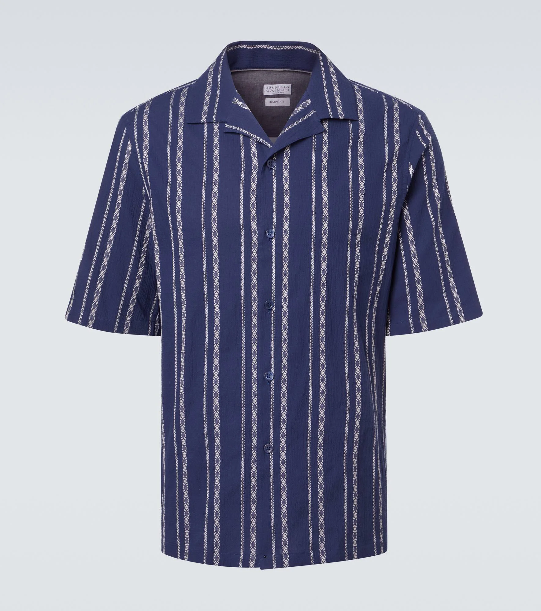 Brunello Cucinelli's designs are created in Solomeo, a medieval hamlet whose art and traditions are woven into the house's every fiber. Made from cotton, this bowling shirt is cut to a loose silhouette with printed geometric motifs. Product Details - Material: 99% cotton, 1% elastane - Care instructions: machine wash at 30 degrees - Made in Italy - Designer color name: Navy Juta - Item color: blue - Material II: 100% cotton - Closure: buttoned front - Item number: P01138431 Size & Fit - True to size - Without pleats in the back - Classic fit - Non-stretchy fabric - Falls below the hip - The model in the picture is 185cm-6'1" and wearing a size L