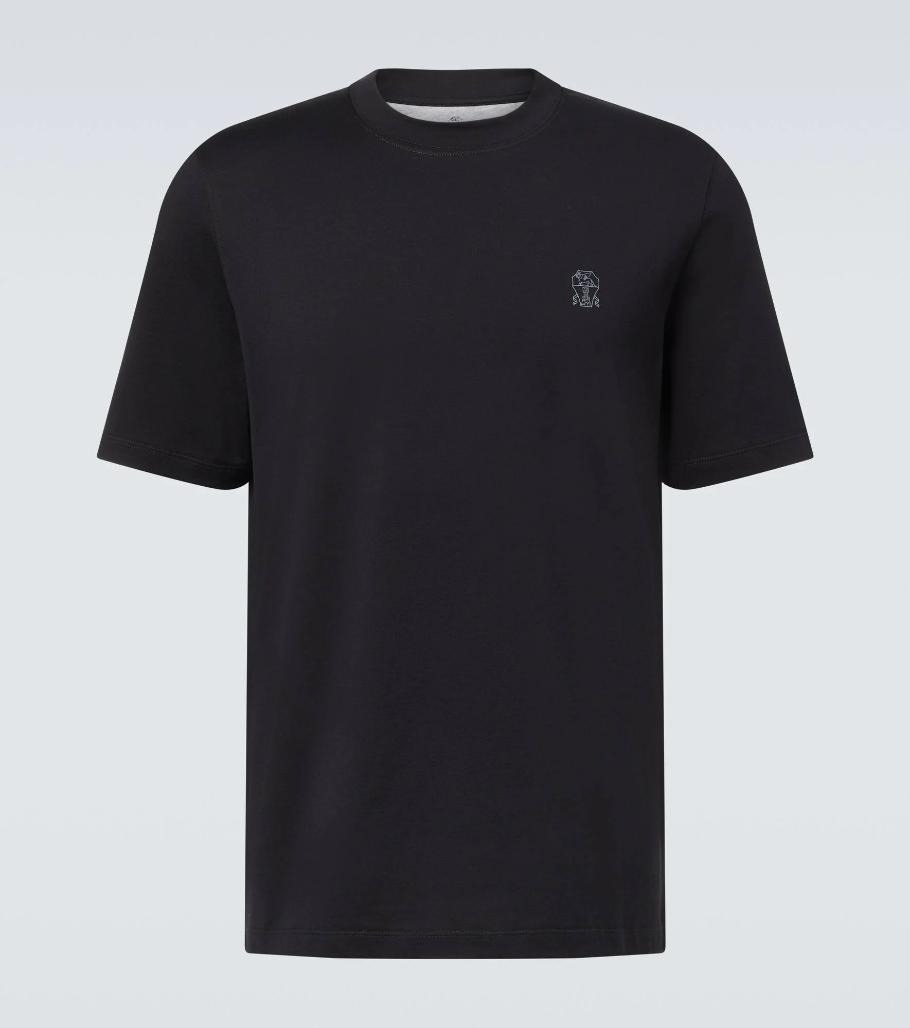 Brunello Cucinelli’s designs are synonymous with timeless craftsmanship and quality. Made from soft cotton jersey, this sophisticated T-shirt features a subtle printed logo, making it a versatile staple for both casual and refined occasions. Product Details - Material: 100% cotton - Care instructions: machine wash at 30 degrees - Made in Italy - Designer color name: Nero+Grigio Chiaro - Item color: black - Item number: P01138477 Size & Fit - True to size - Straight fit - Slightly stretchy fabric - Falls to the hip - The model in the picture is 185cm-6'1" and wearing a size M