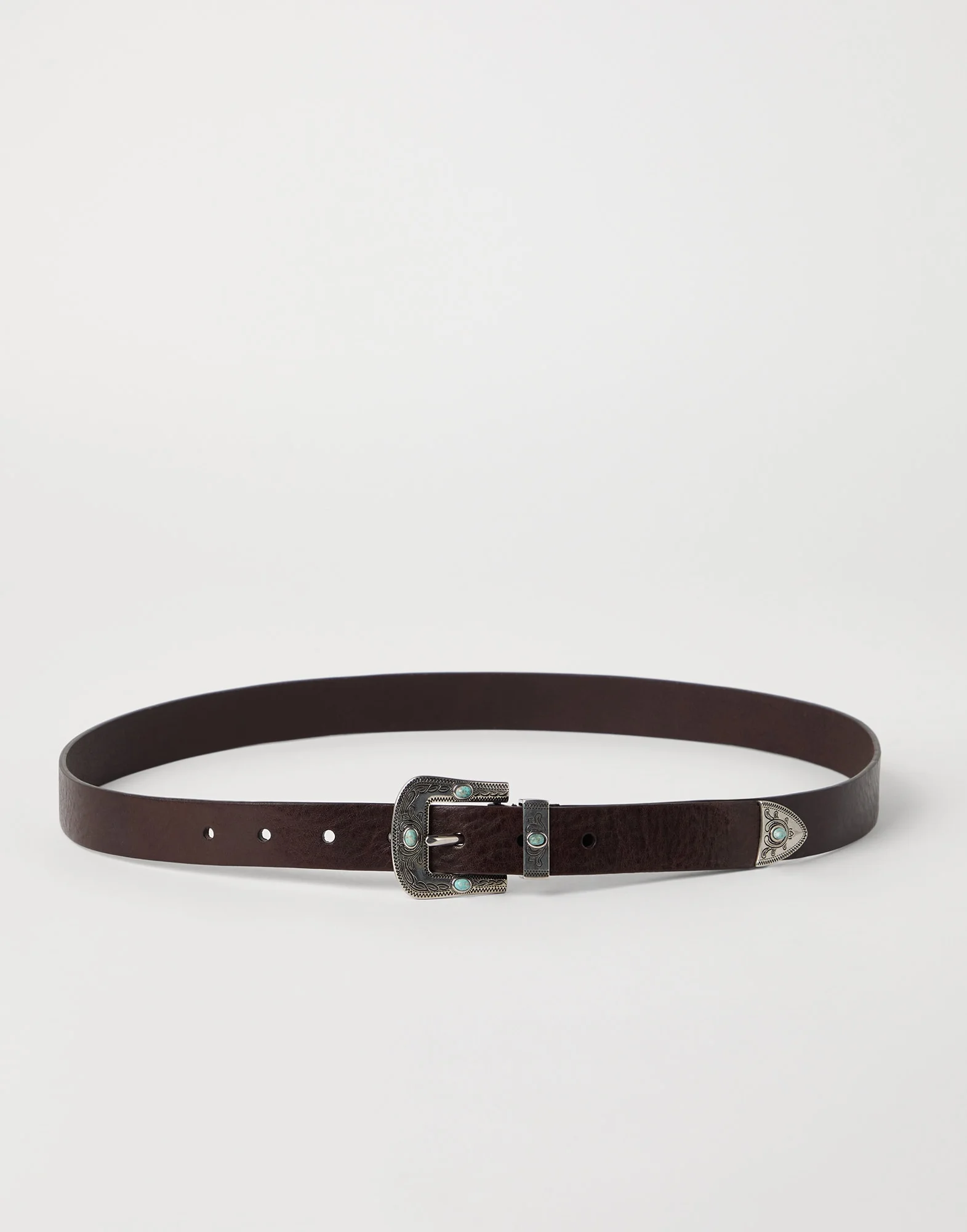 Western-style details define the look of this pull-up calfskin belt, an elegant accessory to complete the season’s looks. The square buckle, loop and tip are sculpted with a pattern and enriched with set stones, giving the accessory a "vintage" touch. MATERIALS The pull-up calfskin leather is enriched with a finish that gives a particular coloration with slight color shading. Thanks to this trait, the leather tends to evolve and acquire character with use. DETAILS Belt height approx. 2.5 cm (0,98") REAL LEATHER