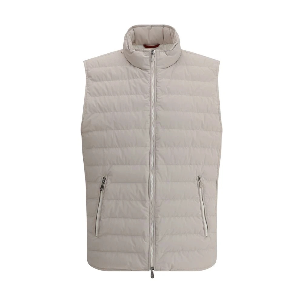 Stay warm and stylish with Brunello Cucinelli's Down Vest for men. This functional garment features a high collar for extra protection and warmth, a front zipper closure for convenience, and two welt pockets with side zippers for added functionality. The monochrome pattern gives a clean and sophisticated look, while the quilted design and padding ensure comfort and warmth. Perfect for staying elegant on the coldest days. Designer color: Gray Designer ID: MIINTO-fc8a2ddd049744ea3555