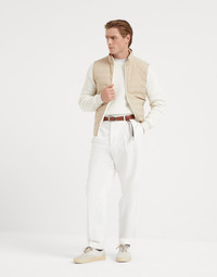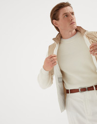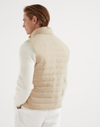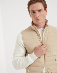 The quality of the materials and skillful techniques enhance the sporty feel of this lightweight zipper down vest. The typical texture of taffeta, smooth and matte-looking, highlights the season's nuances and enriches this quilted outerwear piece, complemented by an inner membrane and a light padding for extra protection. The fit offers straight and regular proportions. MATERIALS Nylon taffeta offers a lightweight, fluid and compact texture with a smooth, semi-matte appearance. The percentage of elastane in the fabric provides added comfort, while the addition of a thin bonded layer enhances protection from the elements without compromising breathability. All of the goose down fill comes exclusively from European suppliers who are members of the EDFA (European Down and Feather Association), which guarantees animal and environmental welfare. DETAILS Two-way zip closure Stand-up collar Hand pockets with zipper Water-resistant nylon lining Internal pocket with zip closure High quality goose down fill 87% NYLON, 13% ELASTANE