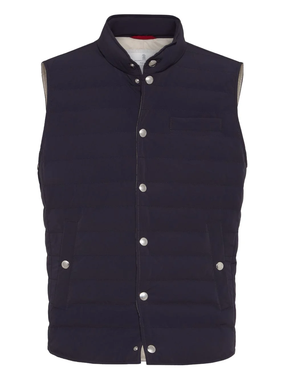 quilted snap-fastening gilet Highlights - Navy blue - Quilted design - Snap fastening - High neck - Side pockets - Sleeveless Made in Italy Composition Nylon 87%, Elastane 13% Washing instructions Specialist Cleaning