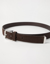 A precious accessory to complete a look with a touch of style, the reverse calfskin belt is characterized by a polished metal square-shape buckle and tip. MATERIALS Reversed calfskin is a leather with a sueded look and a slightly uneven texture that is soft to the touch. DETAILS Belt height approx. 3 cm (1,18") All metal parts are Nickel-free REAL LEATHER