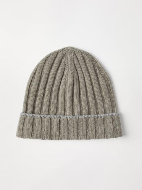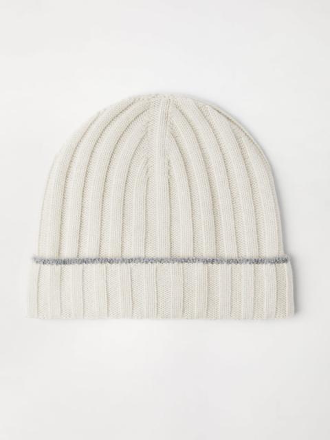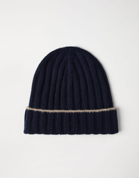 Cashmere, the iconic yarn of the Brunello Cucinelli collections, defines the style of this beanie and guarantees comfort and protection on the coldest days of the season. The classic feel of rib knitting is paired with a contrast color detail along the edge of the accessory. MATERIALS The noble cashmere fiber is characterized by an extreme fineness and also for its precious insulating qualities which guarantee warmth, providing coverage and lightness when worn. DETAILS Rib knit Unlined 100% CASHMERE