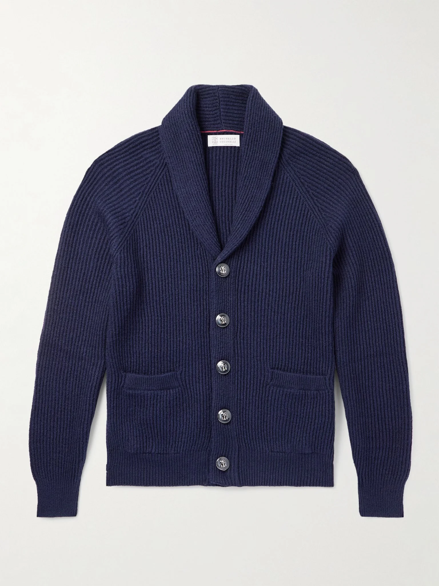 A shawl-collar cardigan makes a great stand-in for a sport coat, especially when the dress code is a little more relaxed. Brunello Cucinelli's is rib-knitted from soft cotton and has horn buttons through the front. Size & Fit - Fits true to size. Take your normal size - Designed for a regular fit - Mid-weight knit - Model is shown wearing an IT 48 - Model measures: chest 38"/ 96cm, height 6'0"/ 183cm Details & Care - Navy cotton - Button fastenings - 100% cotton; buttons: 100% horn (Buffalo) - Machine wash