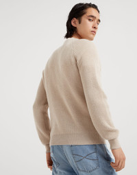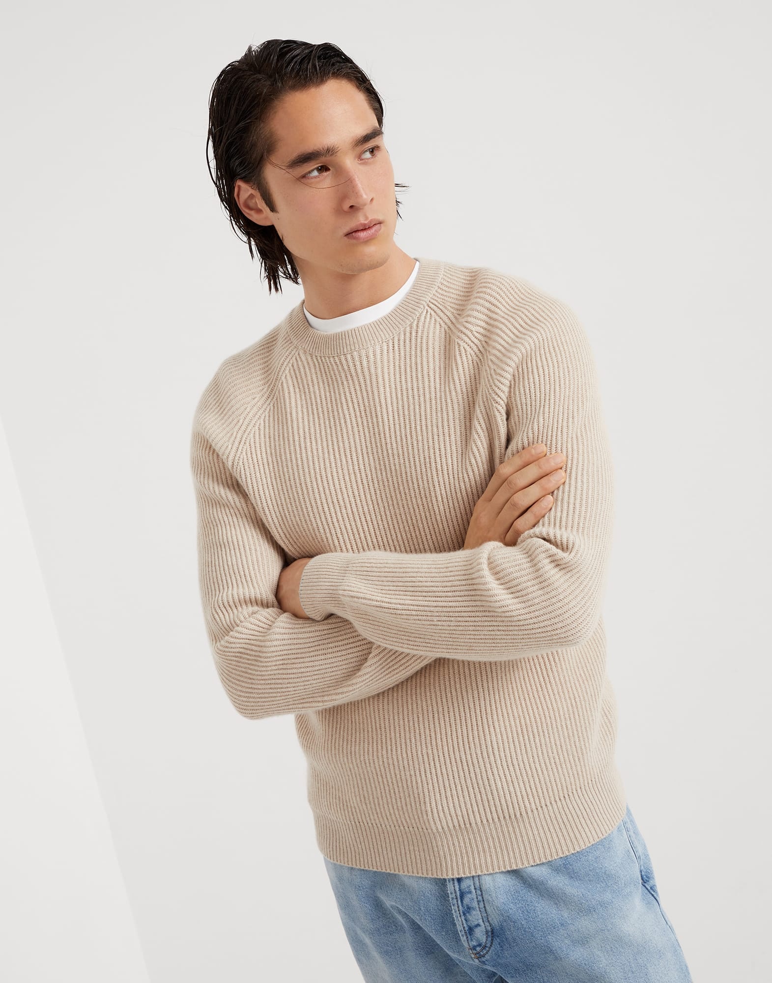Refined contrasts enrich the minimal lines of the pure cashmere sweater, an iconic yarn of the Brunello Cucinelli collections. The traditional English rib knit is paired with sporty-style raglan sleeves and the sophisticated touch of contrasting color trims along the cuffs. The garment offers a regular shape and fit. MATERIALS The noble cashmere fiber is characterized by an extreme fineness and also for its precious insulating qualities which guarantee warmth, providing coverage and lightness when worn. DETAILS Raglan sleeve English rib 100% CASHMERE