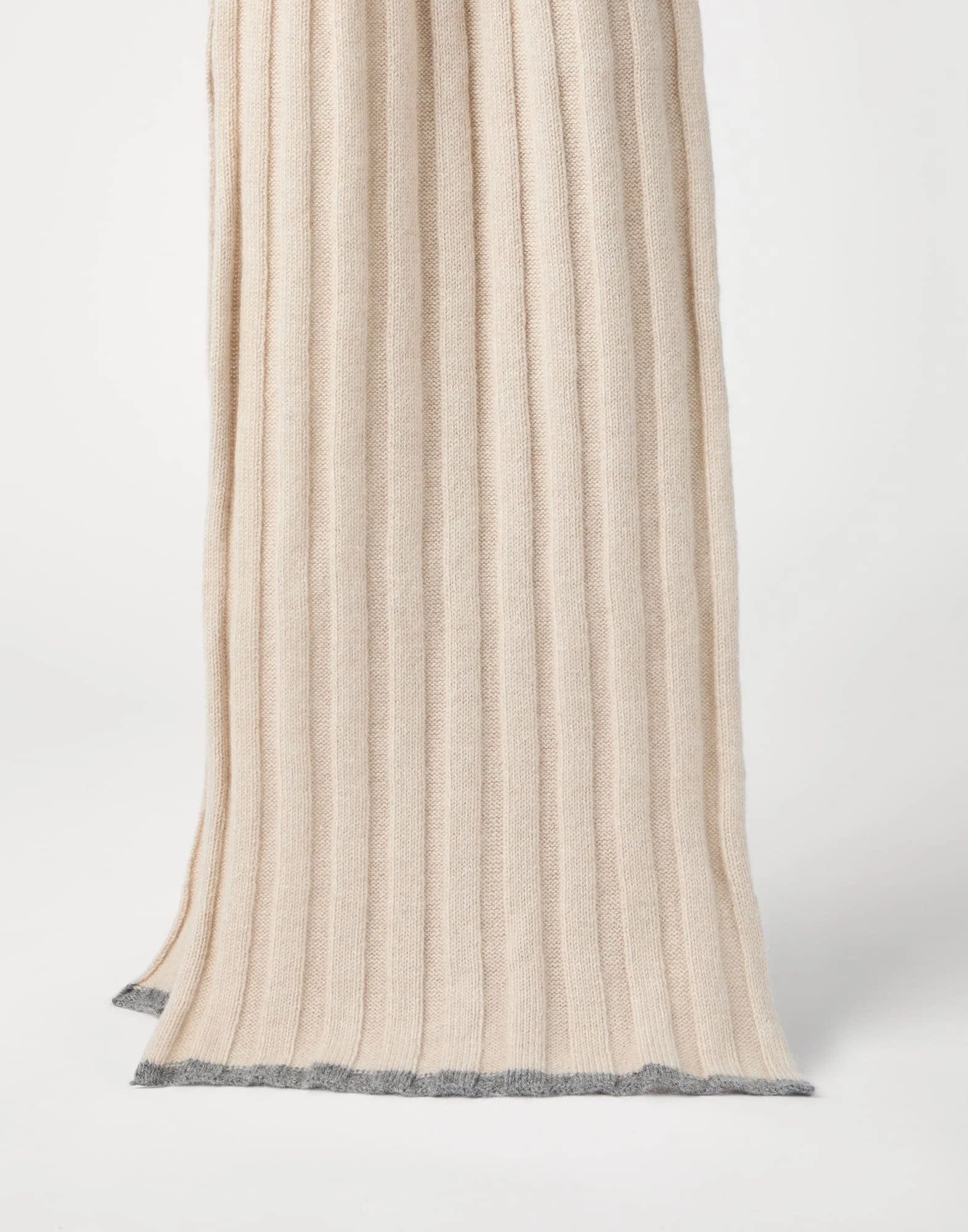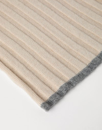 The superior qualities of cashmere enrich this scarf with comfort and lightness to provide the right amount of protection. Traditional rib knitting is paired with a contrast color stripe that stands out on the edges of the short side. MATERIALS The noble cashmere fiber is characterized by an extreme fineness and also for its precious insulating qualities which guarantee warmth, providing coverage and lightness when worn. DETAILS Scarf measures approx. 30 cm (11,81") x 167 cm (65,75") 100% CASHMERE