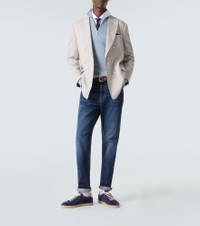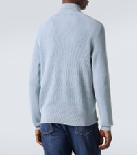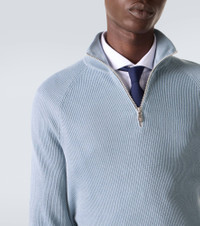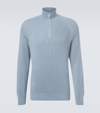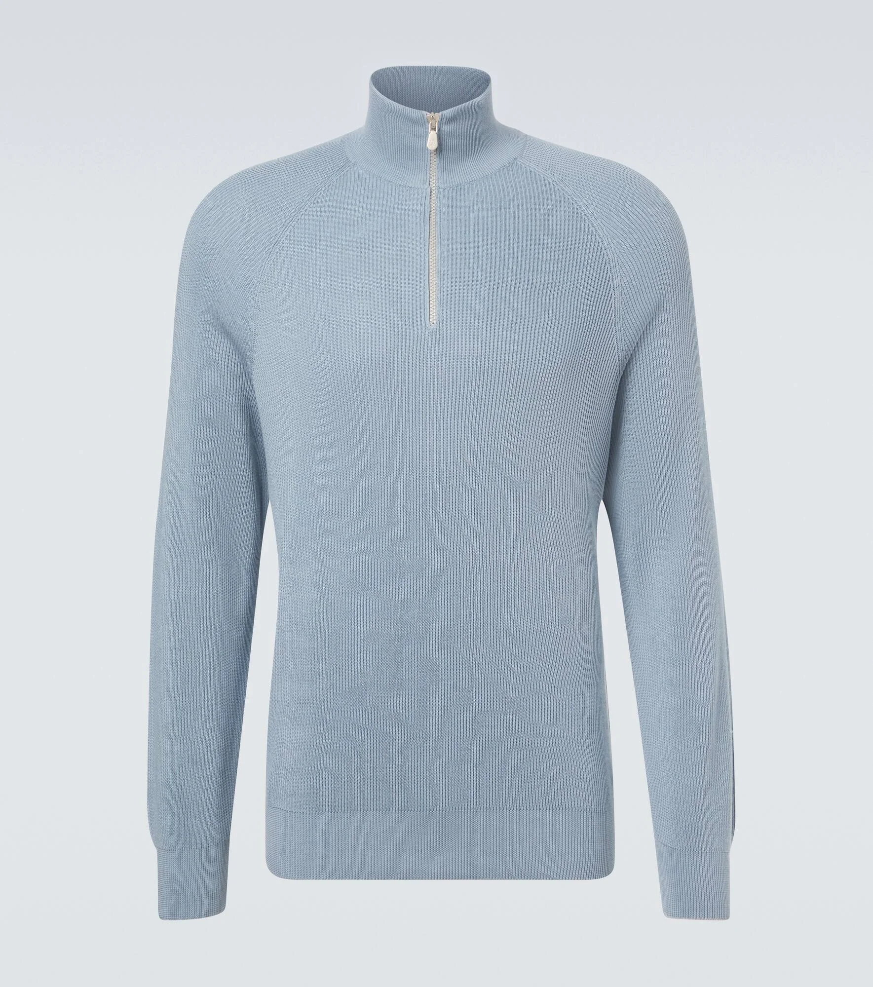 This Brunello Cucinelli sweater completes both laid-back and elevated looks with its soft construction. Crafted from pure cotton, the style features a ribbed-knit finish and a relaxed silhouette. Product Details - Material: 100% cotton - Care instructions: hand wash - Made in Italy - Designer color name: Carta Zucchero+Grigio Chiaro - Item color: blue - Closure: partially zipped front - Cuff: ribbed - Hem: ribbed - Item number: P01138404 Size & Fit - True to size - Straight fit - Stretchy fabric - Falls to the hip - The model in the picture is 185cm-6'1" and wearing a size IT 50