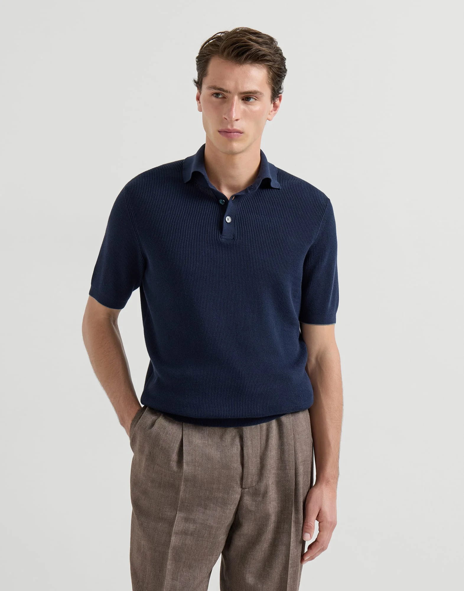 Classic English rib knitting enriches the light, elegant feel of this pure cotton polo-style short sleeve sweater which is perfect for the summer. The horn buttons closure and the contrast color edges of the sleeves complete this piece. Regular proportions are offered by the fit. MATERIALS Manufacturing of the pure cotton yarn enhances the qualities of the natural fibers and makes the garment lightweight and comfortable to wear. DETAILS Button opening Rib knit collar Rib knit cuffs and bottom band English rib 100% COTTON