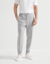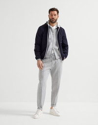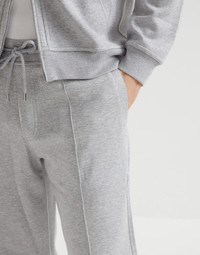 Refined materials enrich the sporty style of the Travelwear line, dedicated to moments of relaxation and free time. The natural fibers of cotton, cashmere and silk, worked in a double fabric, enhance these casual drawstring trousers. The garment is characterized by a “Crete” detail creating a fine permanent crease down the leg, paired with a comfortable fit. MATERIALS Double French terry uses natural cotton, cashmere and silk fibers to provide warmth, softness and protection. The presence of elastic fibers helps to perfect its comfort. DETAILS Rib knit waistband with drawstring Vertical front pockets Crete Rib knit hem with zipper Back welt pocket with button 65% COTTON, 24% NYLON, 7% CASHMERE, 4% SILK
