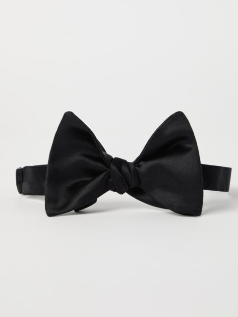 An essential accessory for evening events, the cotton and silk satin bow tie completes tuxedos with classic flair. This accessory, which must be tied, is adjustable thanks to a convenient hook-and-loop closure behind the neck. MATERIALS The cotton and silk satin employs the same fabric that decorates the tuxedo lapels, with a smooth texture and slightly shiny effect. DETAILS Hook closure 50% COTTON, 50% SILK