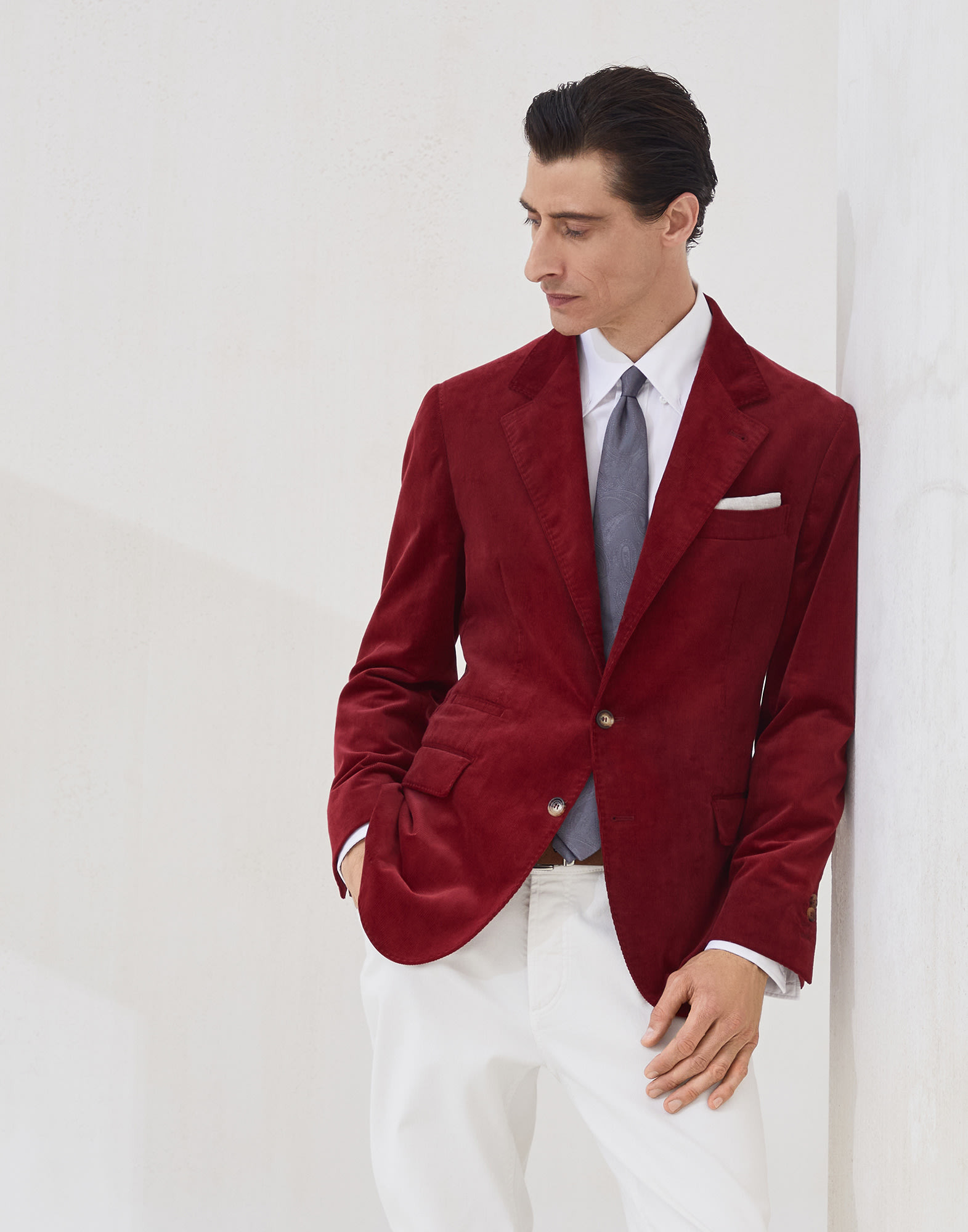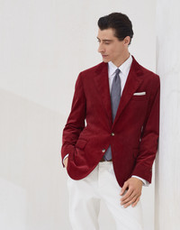The timeless elegance of tailoring is emphasized by the excellence of unique materials in this deconstructed blazer in Sea Island cotton narrow wale corduroy. The natural characteristics of this fiber enrich the season's colors and enhance the modern silhouette with classic lapel. The “Solomeo Shoulder”, named after the hamlet where the company is located, characterizes the Brunello Cucinelli blazer with signature proportions. The tapered and pronounced cut of the shoulder enhances the male physique without the need for padding. MATERIALS Sea Island cotton is grown exclusively in the Caribbean, where the tropical climate causes the plant to develop long, soft and lustrous fibers Limited production of the plant makes this variety of fabric extremely valuable. DETAILS 3-roll-2 closure with horn buttons Notched lapel Welt pockets with flap, ticket pocket and chest pocket Cuffs have four horn buttons and functional buttonholes Cupro half lining Two interior pockets with button closure and pen holder Double back vent Drop 7 100% COTTON