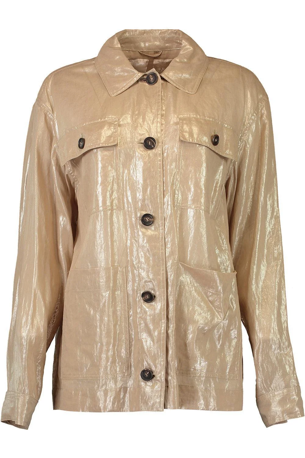 DETAILS AND INSIGHT Brunello Cucinelli shimmery gauze jacket in camel/platino. 100% Cotton Dry Clean Made In Italy Style ML9507823P-C270