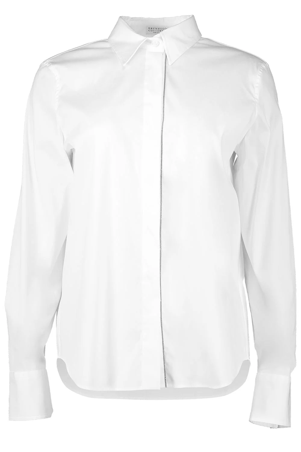 DETAILS AND INSIGHT Brunello Cucinelli shiny trim stretch shirt in white. 72% COTTON, 23% NYLON, 5% ELASTANE, Nickel-Free Monili Dry Clean Made in IT Style M0091MA626-C159