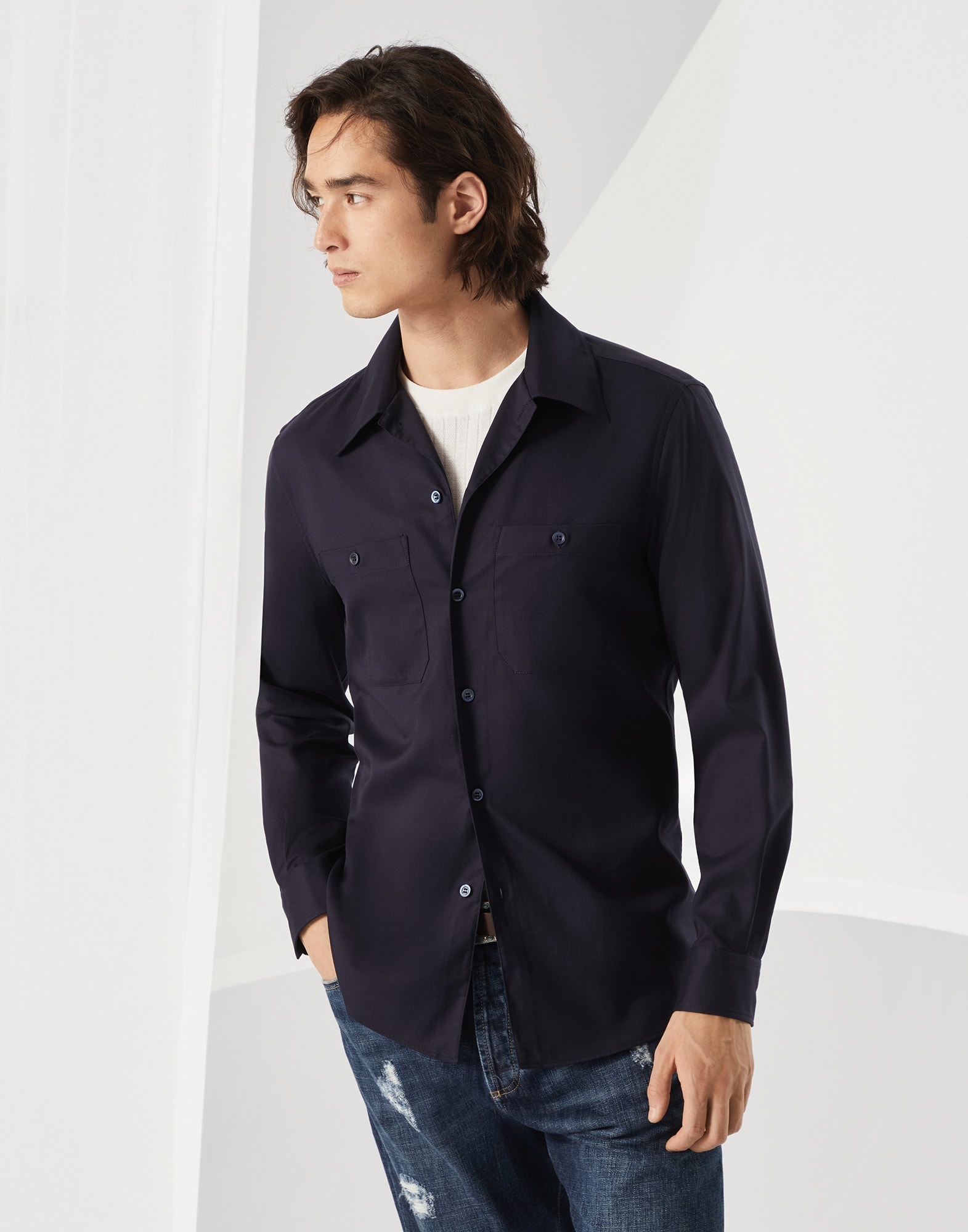 Characterized by refined materials and a versatile spirit, this shirt pairs the casual, lightweight feel of garment-dyed cotton twill with the distinctive detail of the chest pockets. The easy fit is characterized by regular lines and a slightly shorter length than other fits, making it ideal to wear over trousers for a casual look. MATERIALS Garment-dyed pure cotton twill is a lightweight, comfortable fabric that is suitable to wear throughout the year. DETAILS Plain front closure with mother of pearl buttons Classic collar Two patch chest pockets Cuffs have one mother of pearl button Easy fit 100% COTTON