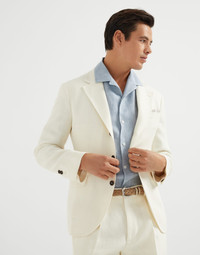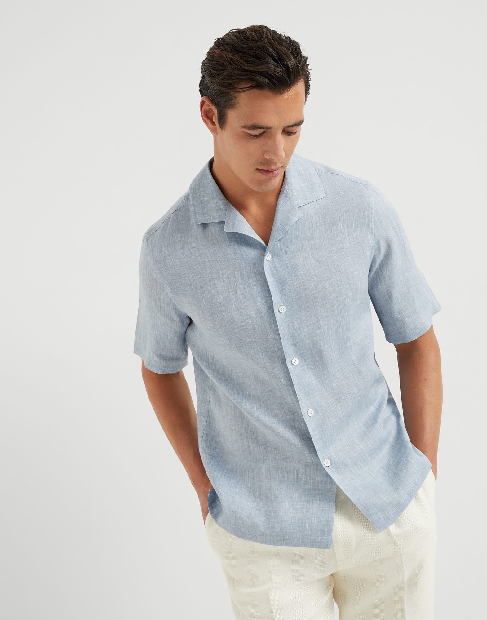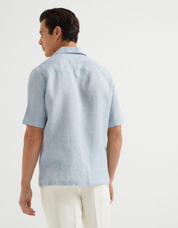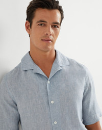 The excellence of Brunello Cucinelli’s natural materials is combined with the attitude of relaxed elegance of this easy fit short sleeve shirt. The ultra-lightweight, cooling touch of linen pairs perfectly with the vintage style of the camp collar. Defined by its regular, rather straight lines, the easy fit has a slightly shorter length than other fits, making it perfect to wear over trousers for a casual look. MATERIALS Thanks to its natural qualities, pure linen fabric is one of the most suitable materials for the season. Lightweight, breathable, and with a dry hand, the slightly irregular texture of the fabric is characterized by the classic slub effect created by the natural linen fibers. DETAILS Plain front closure with mother of pearl buttons Camp collar Sleeves with flat pressed hem Side vents at bottom Easy fit 100% LINEN