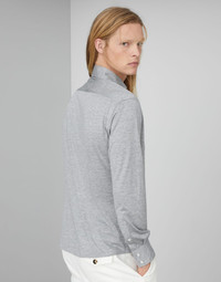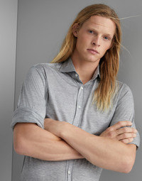 Classic elegance and casual materials come together to define the style of this spread collar shirt. The lightweight texture of silk and cotton jersey is paired with a fit that offers regular, tapered lines. MATERIALS The smooth, lightweight jersey fabric combines the qualities of the noble silk fibers, which gives a slight shiny effect to the fabric, with the compact and fluid appearance of cotton. DETAILS Button fastening with placket Spread collar Buttons at cuffs Slim fit 62% SILK, 38% COTTON