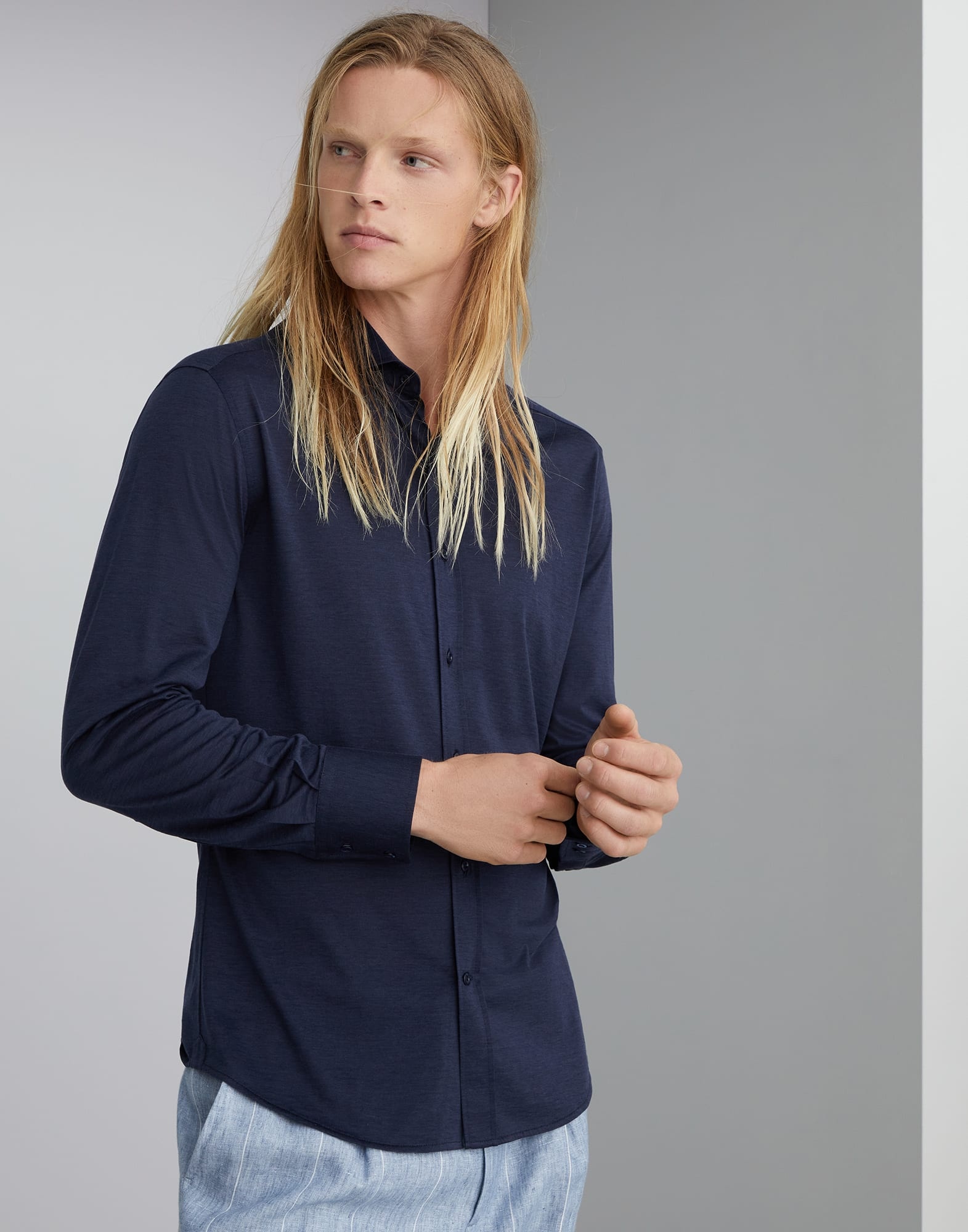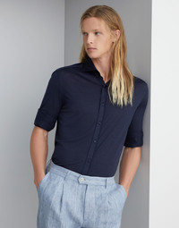 Classic elegance and casual materials come together to define the style of this spread collar shirt. The lightweight texture of silk and cotton jersey is paired with a fit that offers regular, tapered lines. MATERIALS The smooth, lightweight jersey fabric combines the qualities of the noble silk fibers, which gives a slight shiny effect to the fabric, with the compact and fluid appearance of cotton. DETAILS Button fastening with placket Spread collar Buttons at cuffs Slim fit 62% SILK, 38% COTTON