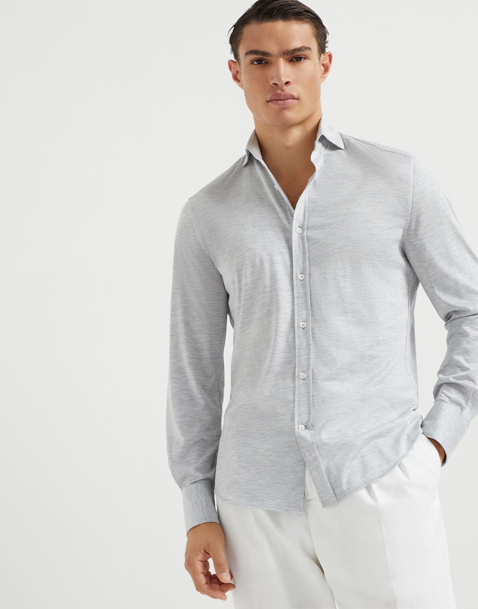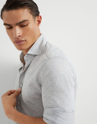 Classic elegance and casual materials come together to define the style of this spread collar shirt. The lightweight texture of silk and cotton jersey is paired with a fit that offers regular, tapered lines. MATERIALS The smooth, lightweight jersey fabric combines the qualities of the noble silk fibers, which gives a slight shiny effect to the fabric, with the compact and fluid appearance of cotton. DETAILS Button fastening with placket Spread collar Buttons at cuffs Slim fit 62% SILK, 38% COTTON