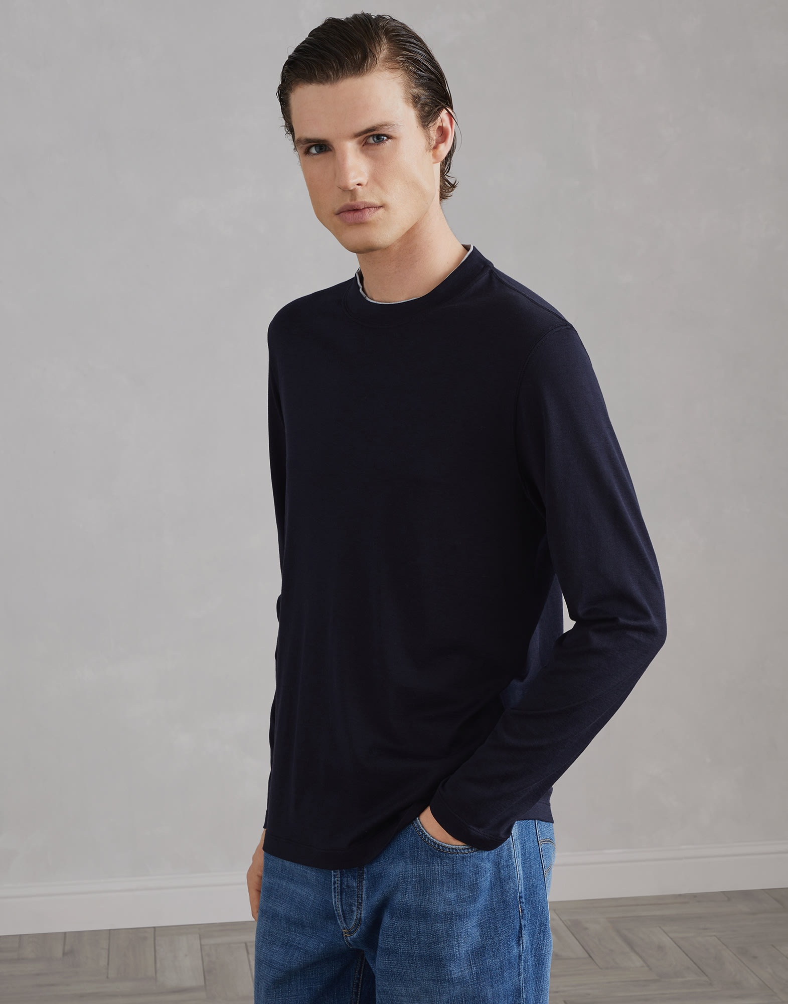 Silk and cotton lightweight jersey long sleeve crew neck T-shirt with contrast detail