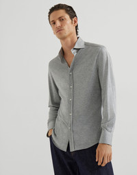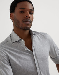A mix of refined yarns elevates the casual style of this jersey shirt. The fabric is updated with the blend of cotton and silk, which provides lightness and a smooth sensation against the skin. The spread collar detail completes the regular fitting style. MATERIALS Lightweight jersey combines the refined qualities of the natural silk and cotton fibers to make the texture extremely pleasing to wear. The fabric is very lightweight with a smooth and soft hand. DETAILS Placket closure with mother of pearl buttons Spread collar Cuffs have two mother of pearl buttons 62% SILK, 38% COTTON