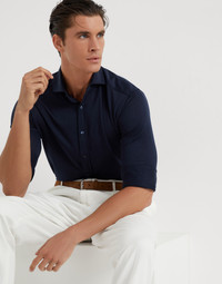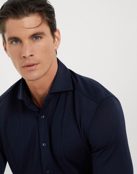 A mix of refined yarns elevates the casual style of this jersey shirt. The fabric is updated with the blend of cotton and silk, which provides lightness and a smooth sensation against the skin. The spread collar detail completes the regular fitting style. MATERIALS Lightweight jersey combines the refined qualities of the natural silk and cotton fibers to make the texture extremely pleasing to wear. The fabric is very lightweight with a smooth and soft hand. DETAILS Placket closure with mother of pearl buttons Spread collar Cuffs have two mother of pearl buttons 62% SILK, 38% COTTON