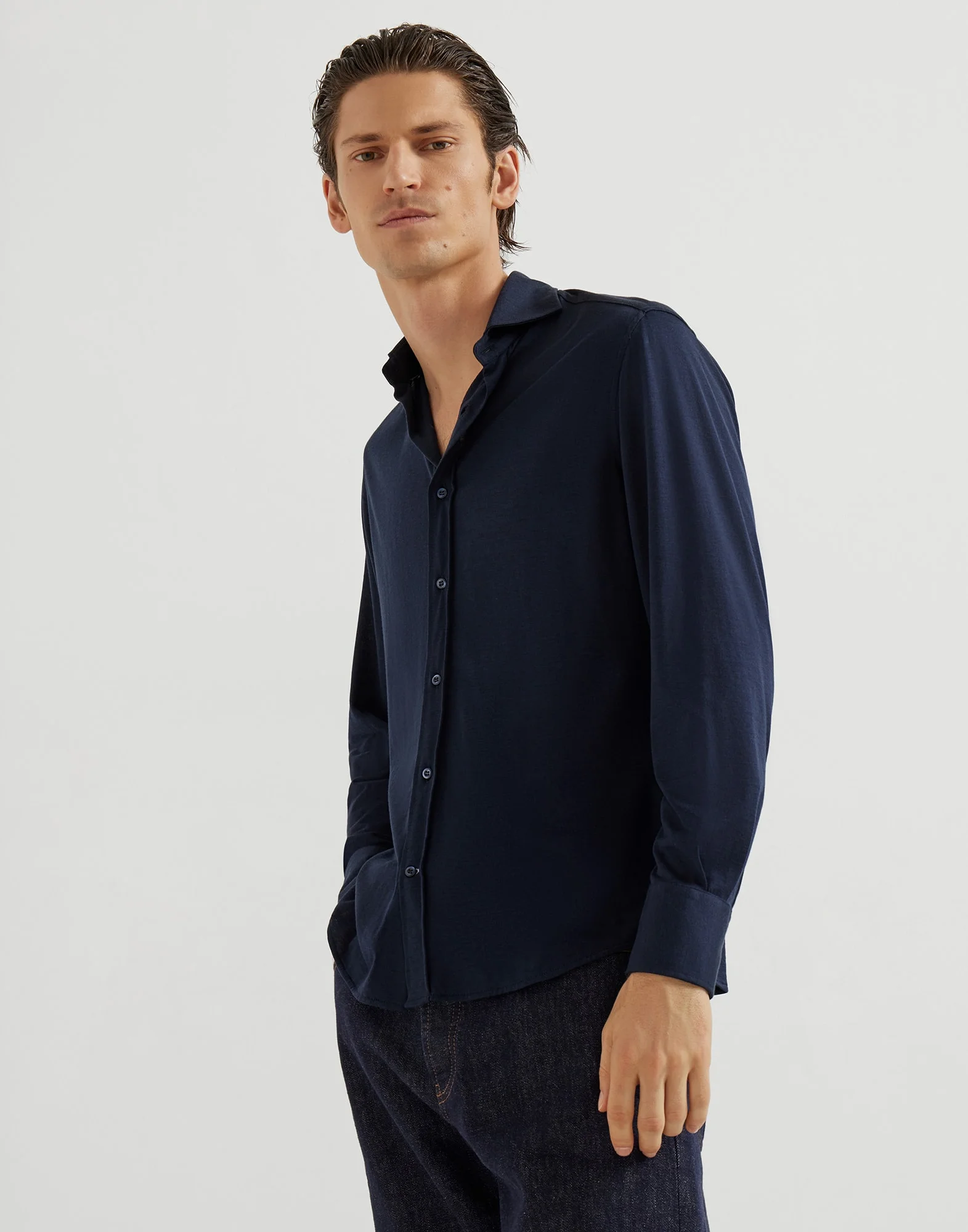A mix of refined yarns elevates the casual style of this jersey shirt. The fabric is updated with the blend of cotton and silk, which provides lightness and a smooth sensation against the skin. The spread collar detail completes the regular fitting style. MATERIALS Lightweight jersey combines the refined qualities of the natural silk and cotton fibers to make the texture extremely pleasing to wear. The fabric is very lightweight with a smooth and soft hand. DETAILS Placket closure with mother of pearl buttons Spread collar Cuffs have two mother of pearl buttons 62% SILK, 38% COTTON