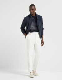 The excellence of Brunello Cucinelli’s natural yarns enriches the casual, relaxed style of this silk and cotton jersey T-shirt. The fabric is enhanced by a striped pattern detailed in the season’s colors, a delicate balance between the compact lightness of cotton and the sheen of the silk fibers. The crew-neck design with a regular, comfortable fit is completed by the chest pocket. MATERIALS Delivered in the season’s colors, the two-tone striped pattern adds a casual touch to the refined silk and cotton jersey, which features a crisp, fluid hand, highlighted by the natural sheen and lightness of the fibers. DETAILS Crew-neck in rib knit Sleeves with flat pressed hem Flat pressed hem Patch chest pocket Regular fit 62% SILK, 38% COTTON