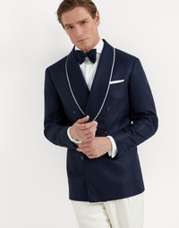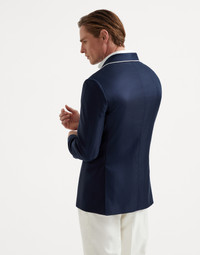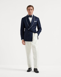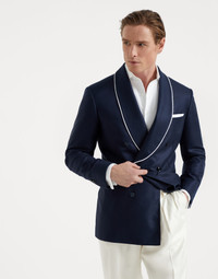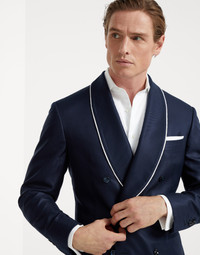 The refined feel of Brunello Cucinelli yarns reinterprets the iconic elegance of the tuxedo in a contemporary way using new fabrics and craftsmanship. The silk diagonal twill jacket is enriched with the fabric’s glossy, compact texture, highlighted by the contrasting edges that outline the retro-inspired shawl lapels. Close fitting through the chest with slightly pronounced shoulders, the construction of the one-and-a-half-breasted jacket highlights the male physique. MATERIALS The compact structure of the diagonal twill weave enhances the natural sheen of the silk fibers with a distinct texture with a light, smooth feel. The cupro lining provides added comfort. DETAILS Six button fastening Shawl lapel Welt pockets and chest pocket Cuffs have four mother of pearl buttons and functional buttonholes Double back vent Two interior pockets with button closure and pen holder Lined Drop 7 100% SILK