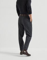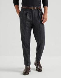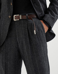A blend of refined fibers infuses lightness into the tailored silhouette of these leisure-fit wool, silk and cashmere flannel trousers. The balanced proportions defined by the double pleats are enhanced by the irregular color of the flecked yarn, which updates the classic chalk stripe pattern. Their leisure fit offers comfortable, modern proportions with soft lines in the seat and a slight low-rise cut. MATERIALS The chalk stripe flannel combines the comfort, warmth and lightness of natural fibers with a classic pattern inspired by the world of tailoring. The crafting of the knop yarn enriches the material’s texture with the characteristic mottled color. The lining completes the garment and makes wearing comfortable. DETAILS Zip closure with button, metal hook and backing button Slanted front pockets Double pleat Back welt pockets Cuffed hem Leisure fit: the rise and seat are soft and the proportions of the leg are tapered 51% SILK, 47% WOOL, 2% CASHMERE
