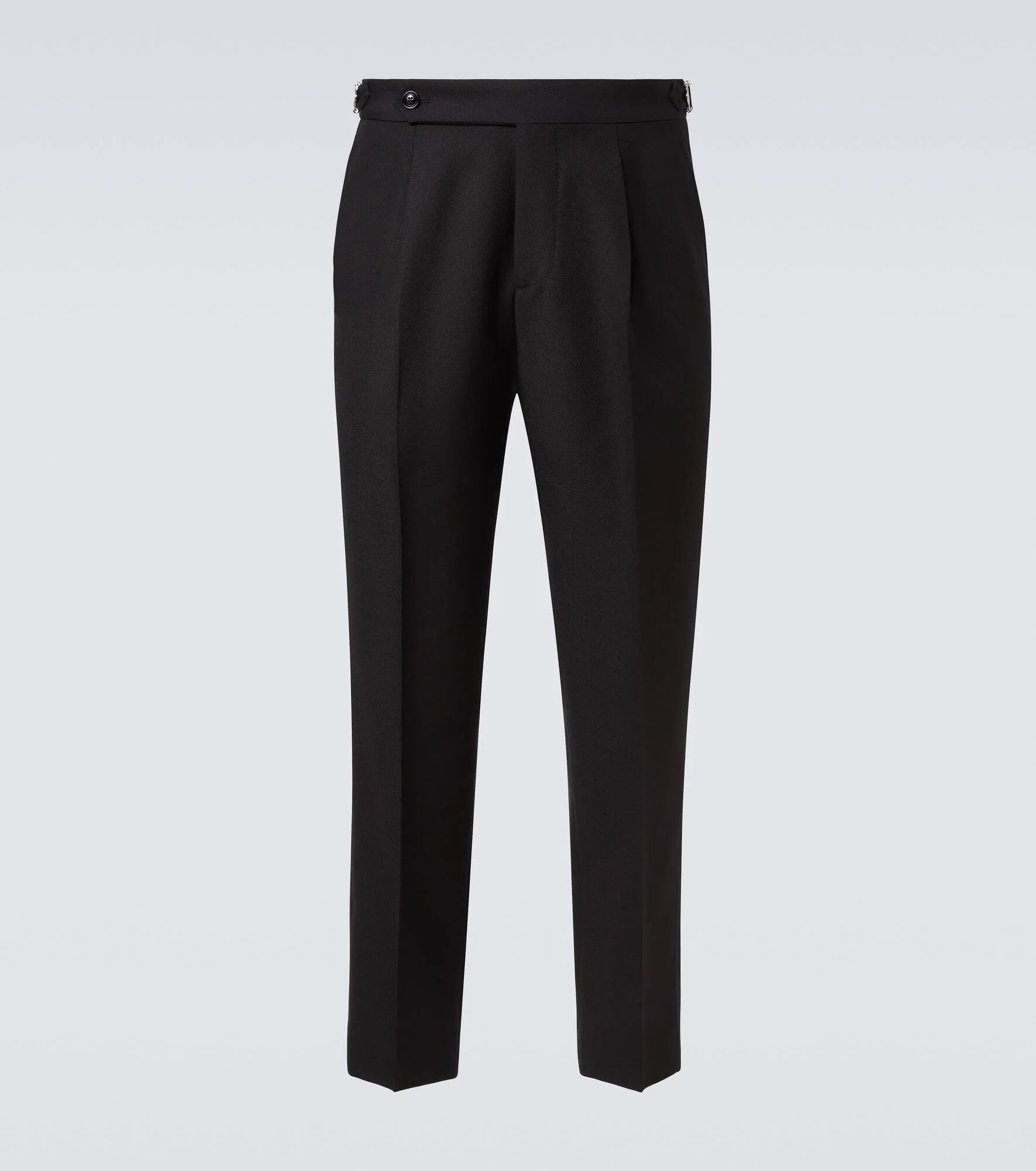 Brunello Cucinelli blends Italian craftsmanship with a refined, contemporary aesthetic across thoughtfully designed wardrobe staples. Made from a silk, wool, and mohair blend, these suit pants have side slit and back pockets and adjustable tabs at the waist. Product Details - Material: 52% silk, 26% wool, 22% mohair - Care instructions: dry clean - Made in Italy - Designer color name: Nero+Nero - Item color: black - Material II: 50% cotton, 50% silk - Lining: 100% cupro - Lining II: 100% viscose - Contains non-textile parts of animal origin - Closure: zipper fly, button and hook fastenings - Pockets: side slit pockets, back pockets - Adjustable tabs at the waist - Item number: P01095114 Size & Fit - True to size - Adjustable at the waist - Non-stretchy fabric - Straight leg - Height of model is 187cm-73.5" and wears a size 50