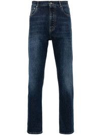 straight-leg jeans Highlights - Indigo blue - Cotton blend - Washed denim - Whiskering effect at the thighs - Embroidered logo to the front - Logo patch to the rear - Mid-rise - Belt loops - Button fly fastening - Classic five pockets - Straight leg Made in Italy Composition Outer: Calf Leather 100%, Cotton 98%, Elastane 2% Lining: Cotton 100% SIZE & FIT Model measurements Height 6 ft 1 in(1.86 m) Bust/Chest 37.4 in(95 cm) Hips 36.22 in(92 cm) Waist 29.52 in(75 cm) FittingInformation Designed for a slim fit, these jeans offer a comfortable fit that sits just away from the leg Constructed from stretch denim, this piece offers a stretch fit with durability This piece fits true to size – take your usual size