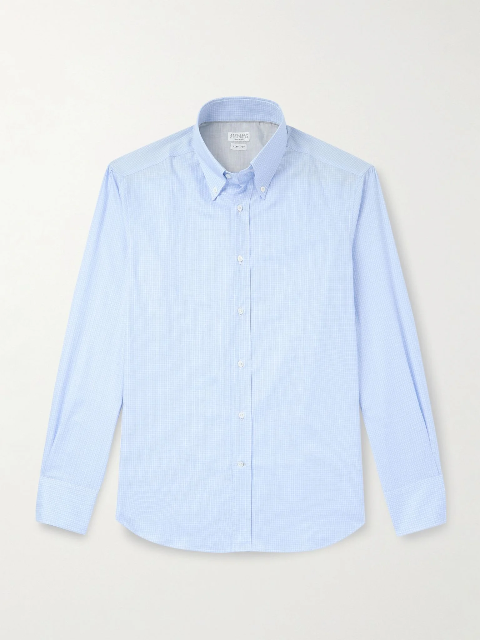 Shirts as classic as Brunello Cucinelli's will move through the years with you. This one has been made in Italy from crisp, airy cotton patterned with neat checks. It fastens with glossy mother-of-pearl buttons. Size & Fit - Fits true to size. Take your normal size - Designed for a slim fit - Lightweight, non-stretchy fabric - Model is shown wearing a M - Model measures: chest 38"/ 96cm, height 6'2"/ 188cm Details & Care - Tonal-blue and white cotton - Button fastenings - 100% cotton - Dry clean - Mother-of-pearl: Indonesia