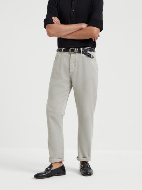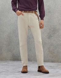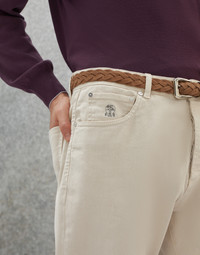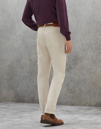The timeless style of this five-pocket silhouette is enriched by dyed comfort denim, a lightweight fabric that moves with the body. The comfortable leisure fit is slightly relaxed through the seat and close to the body along the leg. MATERIALS 9.1 oz. dyed cotton denim is a lightweight fabric enriched with a very small percentage of spandex that provides added comfort. DETAILS Metal button closure Front pockets with watch pocket Back patch pockets 18 cm hem Leisure fit: the rise and seat are soft and the proportions of the leg are tapered 99% COTTON, 1% ELASTANE