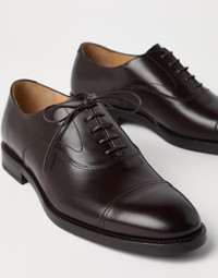 A timeless style of masculine elegance, the cap toe Oxford is interpreted with refined Brunello Cucinelli materials. The smooth, matte and even appearance of Smart calfskin enhances the classic and versatile lines of this footwear. The thin leather and lightweight rubber bottom goes perfectly with the silhouette’s sleek and refined lines. MATERIALS Smart calfskin is characterized by a very smooth, almost grainless matte texture. Moreover, vat dyeing lends an extremely subtle chiaroscuro effect that enhances the color. A leather lining provides added comfort. DETAILS Thin fabric laces Leather lining Sole in leather and lightweight expanded polyurethane 100% REAL LEATHER