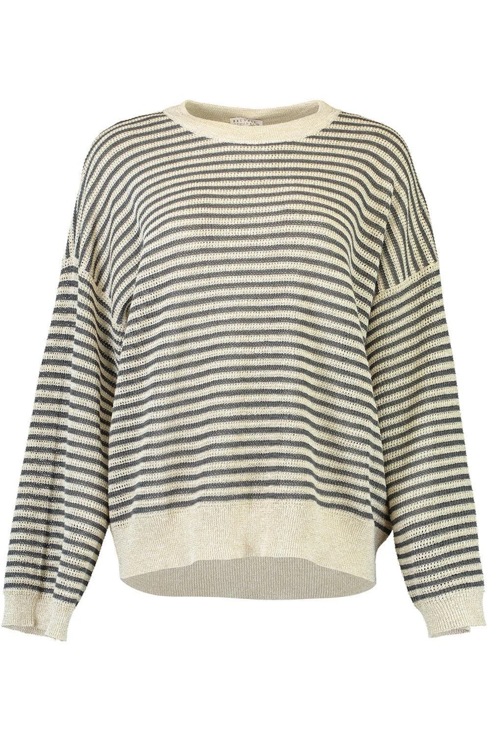 DETAILS AND INSIGHT Brunello Cucinelli sparkling summer striped sweater in anthracite/cream. 45% Linen, 37% Polyester, 10% Metal, 8% Nylon Hand Wash Made in Italy Style M8Q204810P-CVX76