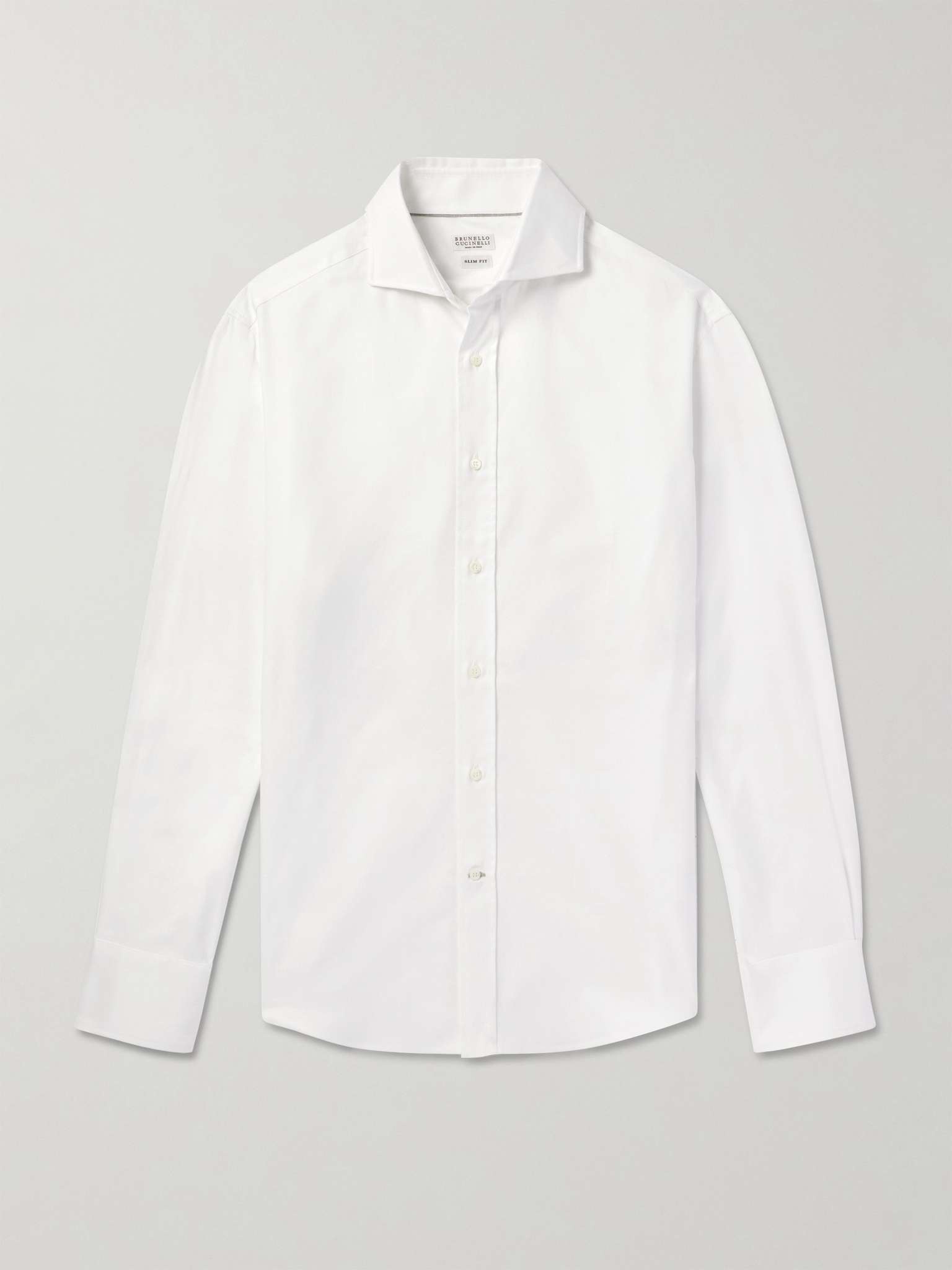 Timelessness and versatility are the driving forces behind all of Brunello Cucinelli's designs. Easy to smarten up for formal events, this Italian-made shirt is cut slim from lightweight cotton-pique and has a cutaway collar to accommodate a wide tie knot. Size & Fit - Fits true to size. Take your normal size - Darted at the back to achieve a slim fit - Lightweight, non-stretchy fabric - Model is shown wearing a M - Model measures: chest 38"/ 96cm, height 6'0"/ 183cm Details & Care - White cotton-pique - Button fastenings - 100% cotton - Machine wash - Mother-of-pearl: Indonesia